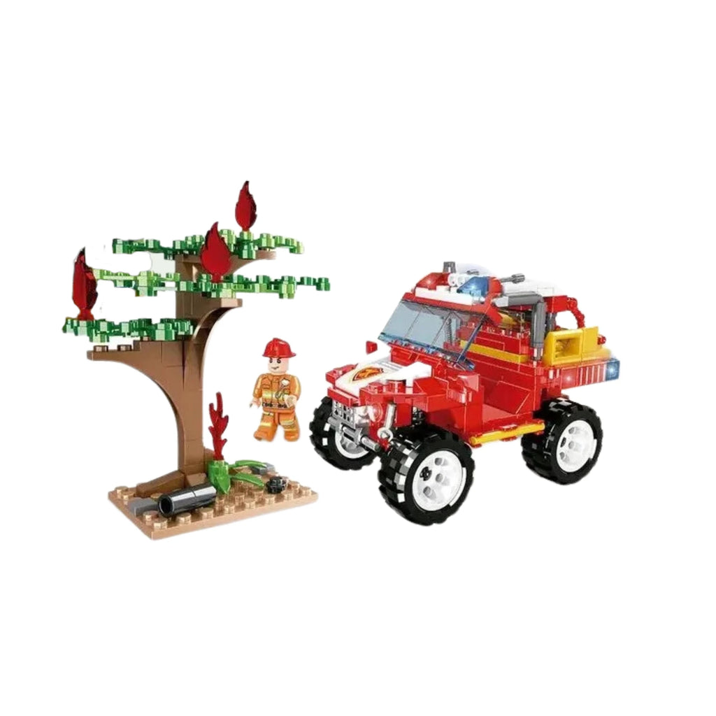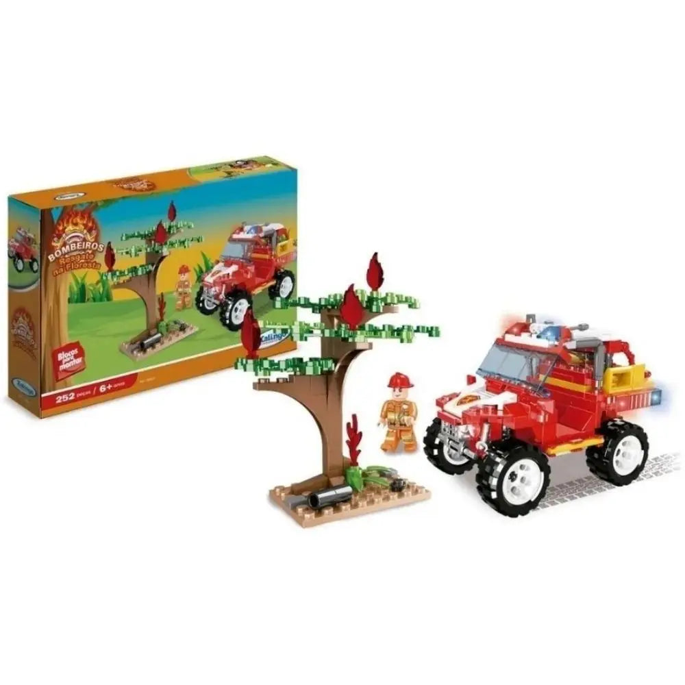 Detalhes: Inclui peças para montar um carro de bombeiros, uma árvore em chamas e um boneco de bombeiro.